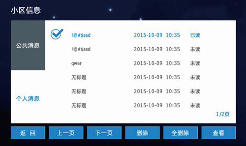 1)存儲管理中心發(fā)布的小區(qū)公共消息與個人消息,包括標題、時間、已讀未讀,可點擊查看詳細的信息內(nèi)容,也可進行刪除與全