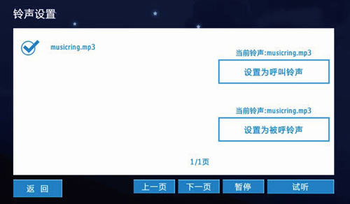 1)支持呼叫鈴聲與被叫鈴聲的設置,可以試聽當前選定的鈴聲,也支持外接SD卡鈴聲,路徑為SD卡根目錄ring文件夾,如圖3.7.3: