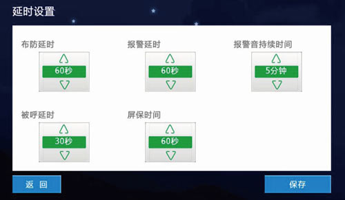 1)設置布防延時,報警延時,報警音持續(xù)時間,被呼延時,屏保時間。布防延時選項為30S,60S,99S。報警延時選項為0S,30S,60S。報警音持續(xù)時間選項為3M,5M,10M。被呼延時選項為30s,60S,90S.屏保時間選項為30S,60S,90S。設置界面如圖3.7.8:
