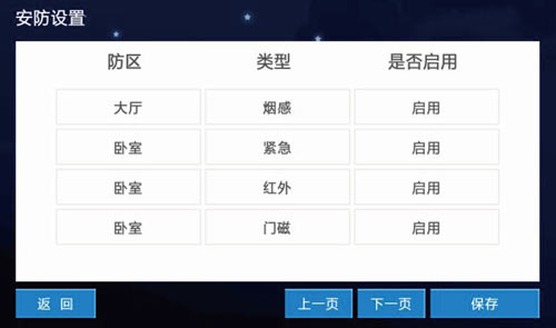 1)設置八防區(qū)的地點,類型和是否啟用,下一頁可查看下一頁的防區(qū)設置,點擊保存可保存防區(qū)信息的設置,如圖3.8.2: