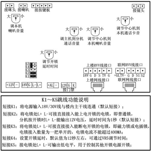 注:主機(jī)默認(rèn)是接電控鎖,如果是接磁力鎖,須把K2插帽拔掉,然后短接K3 和K4插帽,這樣是通過(guò)調(diào)節(jié)VR5來(lái)設(shè)置開鎖時(shí)間,也可以只短接K3,然后通過(guò)在主機(jī)上輸入#00002002+XX來(lái)設(shè)置開鎖時(shí)間。